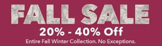 Don't miss our Fall Sale! Shop in store and get 20-40% off on select original-priced fall styles, for a limited time.
