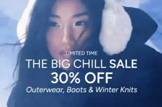 Don't miss The Big Chill Sale! Shop in store and get 30% off on select outerwear, boots and winter knits.